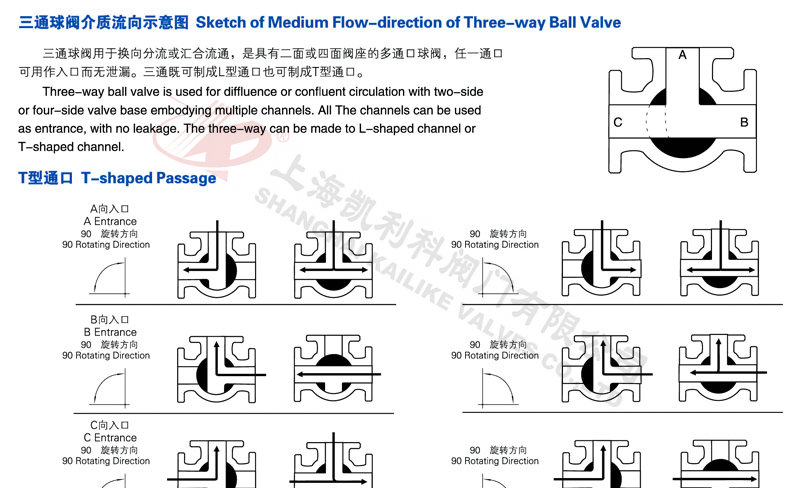 气动三通球阀分L型和T型,介质流通方向见下图。L型气动三通球阀适用于介质流向的切换,能使相互垂直的两个通道连通:T型气动三通球阀适用于介质的分流、合流或流向 切换,T型孔道可以使三个通道互相连通或使其中两个通道连通,气动三通球阀一般采用三个阀座结构,亦可根据用户要求采用四阀座结构。