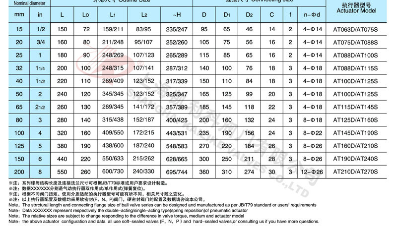 采用新型系列气动执行器,有双作用式和单作用式(弹簧复位),齿轮齿条传动,安全可靠;大口径阀门采用系列AW型气动执行器拔叉式传动,结构合理,输出扭矩大,有双作用式和单作用式。