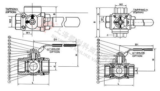 Q14F/Q15F三通内螺纹球阀有T型和L型。T型能使三条正交的管道相互联通和切断第三条通道,起分流、合流作用。L型只能连接相互正交的两条管道,不能同时保持第三条管道的相互连通,只起分配作用。